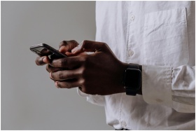A close-up shot of a person wearing a smartwatch a
