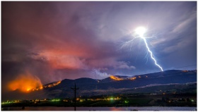 Lightning strikes through a fire-lit sky over Wenatchee, WA, creating a dramatic natural landscape.