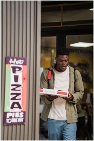 Man holding a pizza box outside a store, with sign