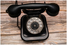 Classic black rotary telephone with dial on wooden