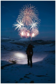 A lone hiker watches fireworks illuminating a snowy winter night, creating a magical outdoor scene.