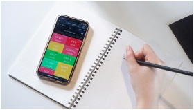 Close-up of a smartphone displaying stock data beside a hand writing in a notebook.