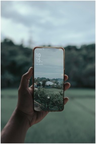 Smartphone with a rural scene displayed, held by a hand in a natural outdoor setting.