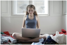 Young woman sitting cross-legged on bed, using laptop and wearing headphones.