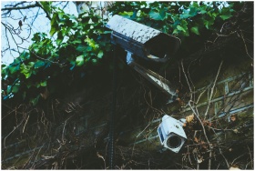 Outdoor surveillance cameras mounted on a vine-cov