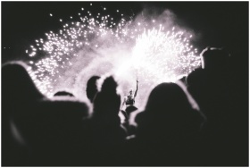 A dramatic black and white photo capturing a nighttime event with fireworks and a silhouetted crowd.