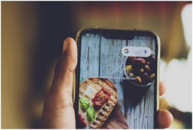 Close-up of a hand holding a smartphone displaying a food image on its screen, indoors.