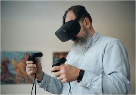 Senior adult playing with VR headset and controllers indoors, exploring metaverse.