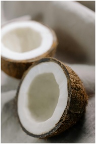 Close-up of fresh, cracked coconut halves on a sof