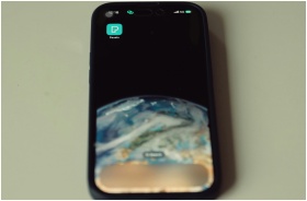 Close-up of smartphone showing Earth wallpaper and Pexels app icon on screen.