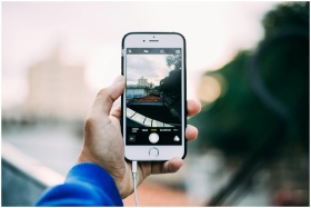 Close-up of a hand holding a smartphone while capturing a cityscape outdoors.