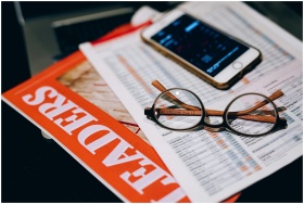 A close-up of business analytics tools including a smartphone, eyeglasses, and papers.