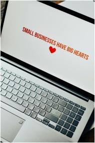Close-up of laptop displaying 'Small Businesses Have Big Hearts' message with a heart icon.