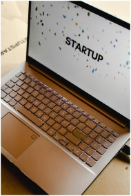 Close-up of a laptop screen displaying the word "STARTUP", ideal for business and tech themes.