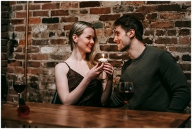 Side view of loving couple sitting near brick wall at wooden table with cupcake with burning candle looking at each other while celebrating anniversary in cafe