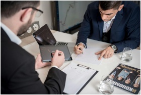 Two businessmen analyzing cryptocurrency market tr