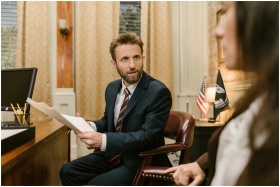 Businessman in suit discussing legal documents in office environment.