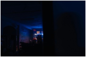 A moody club scene with people sitting in dim ligh