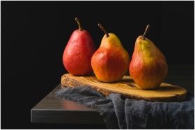 Beautiful display of three ripe red pears on a wooden cutting board.
