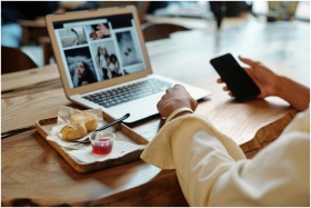 A person working remotely using a laptop and smart