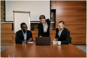 Three business professionals collaborating on a project in a modern conference room with a laptop.