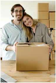 A joyful couple in Portugal starting their online business surrounded by cardboard boxes.
