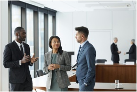 Group of professionals engaged in conversation in