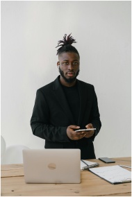 Professional black businessman in business attire standing with a smartphone by a desk in an office.