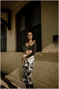 Fashionable woman poses against brick wall in urban daylight.