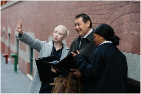 A diverse group of professionals engaged in discussion near a brick wall on the street.