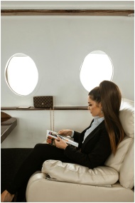 A woman in business attire reads a magazine while seated on a private jet, showcasing luxury travel.