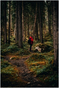 A lone hiker explores a dense forest trail in autu