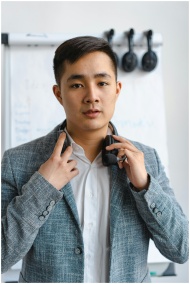 Young businessman in modern office attire adjusting his headphones, standing confidently.