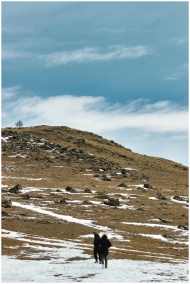 Two people hiking on a snow-covered hillside under