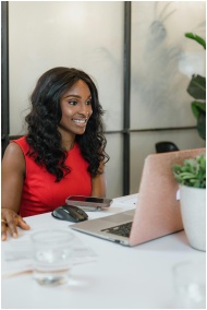 Smiling businesswoman in a red dress engaged in a professional video call, captured indoors.