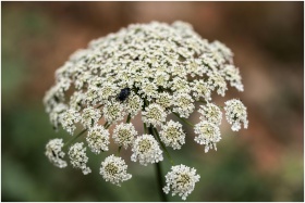 Macro shot of a black beetle on blooming white wildflowers, highlighting nature's intricate details.
