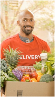 Happy deliveryman in red shirt holding a box of fresh vegetables and fruits outdoors.
