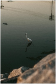 A graceful egret standing in calm waters at dusk, capturing serene wildlife beauty.