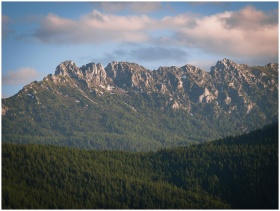 Beautiful view of an Alpine mountain range with lush green forests under a partly cloudy sky.