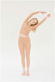 Young woman in beige activewear doing a yoga stretch on a light background.