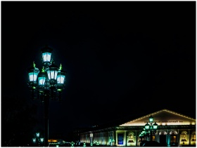 Night view of a historic building illuminated by street lamps, capturing a serene urban nightlife scene.