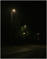 A quiet urban street at night illuminated by streetlights, creating a moody atmosphere.