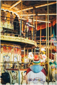 Back view of faceless man in warm clothes being nostalgic looking at festive merry go round on fairground in city park in winter evening