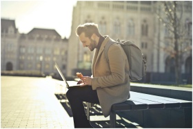 Man working on laptop in Budapest park while enjoying ice cream, showcasing remote work lifestyle.