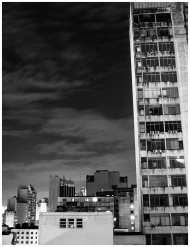Discover the striking contrast of city skyscrapers against a starry night sky in black and white.