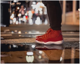 Stylish red sneakers on a wet urban street reflecting city lights at night.