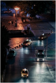 A dark, rainy street view of London with cars and