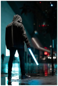 Silhouetted person in hoodie holding glowing light stick on rainy city street at night.