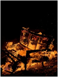 Dramatic shot of a wooden structure engulfed in flames at night, showing intense fire and sparks.