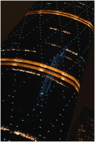Illuminated skyscraper featuring reflective glass